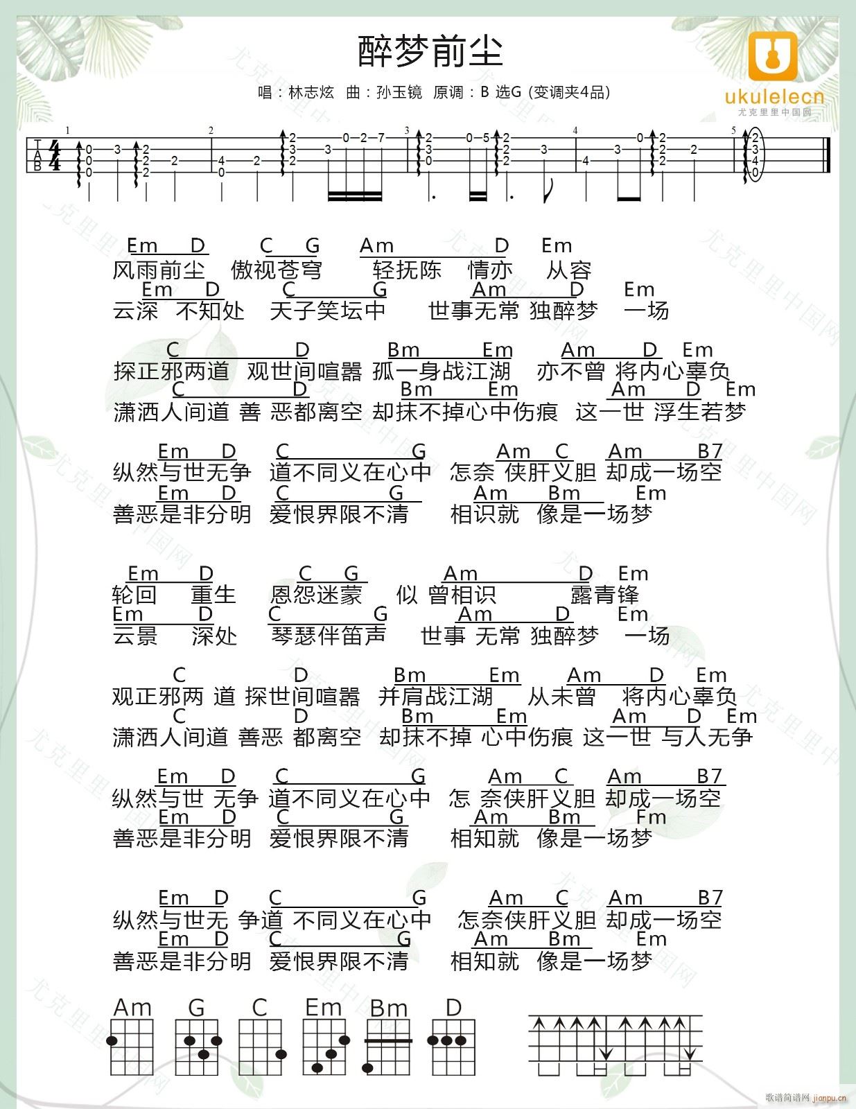 [十字及以上]醉梦前尘尤克里里谱( G调带前奏版) 林志炫
