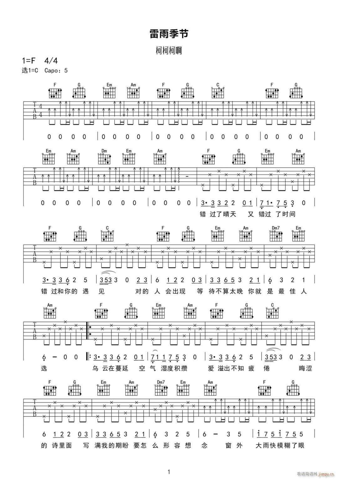 [吉他谱]雷雨季节 ( C调扫弦版) 柯柯柯啊