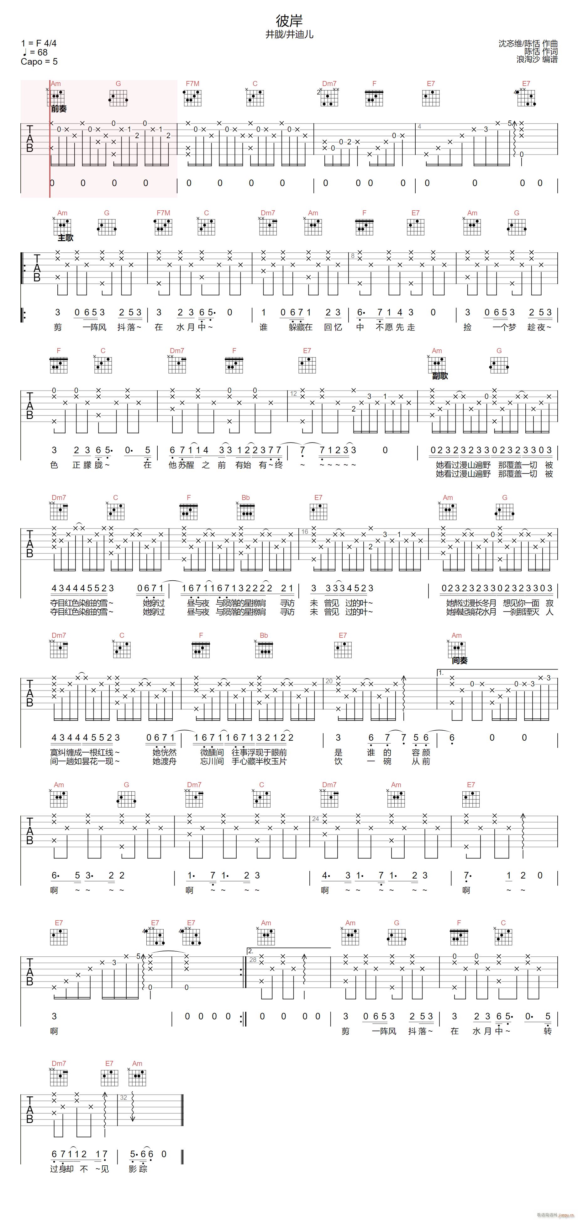 [吉他谱]彼岸 ( 井迪儿 C调原版编配) 井胧