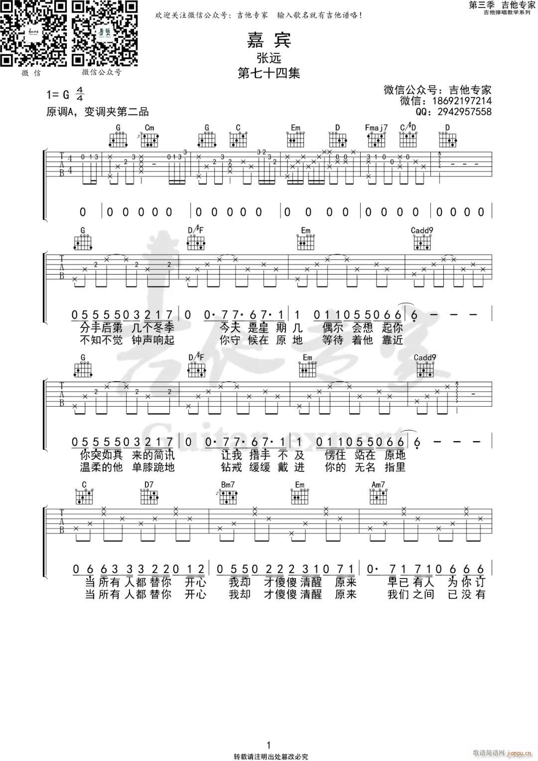 [吉他谱]嘉宾 ( G调指法原版编配) 张远