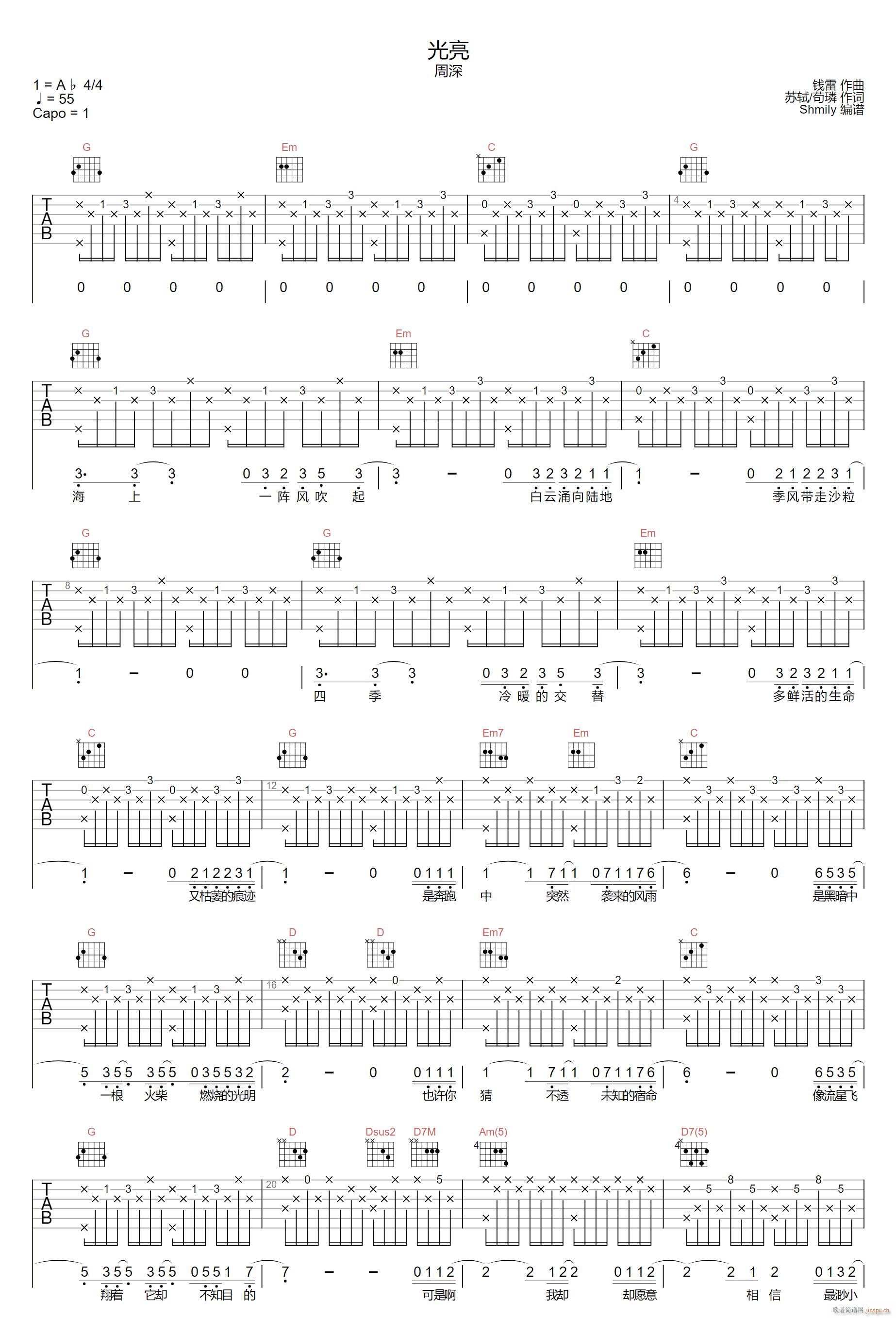[吉他谱]光亮 ( G调指法原版编配) 周深