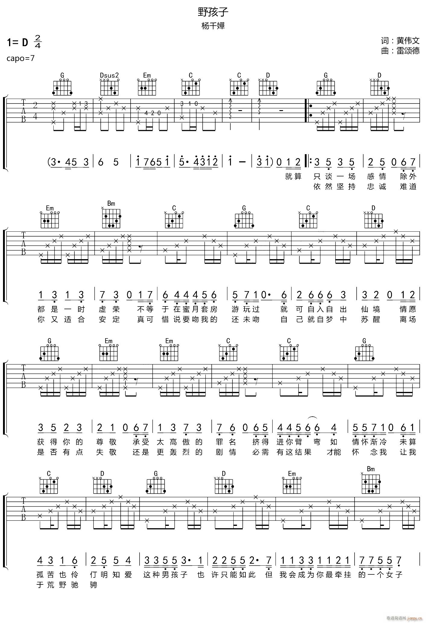 [吉他谱]野孩子 ( G调原版编配) 杨千嬅