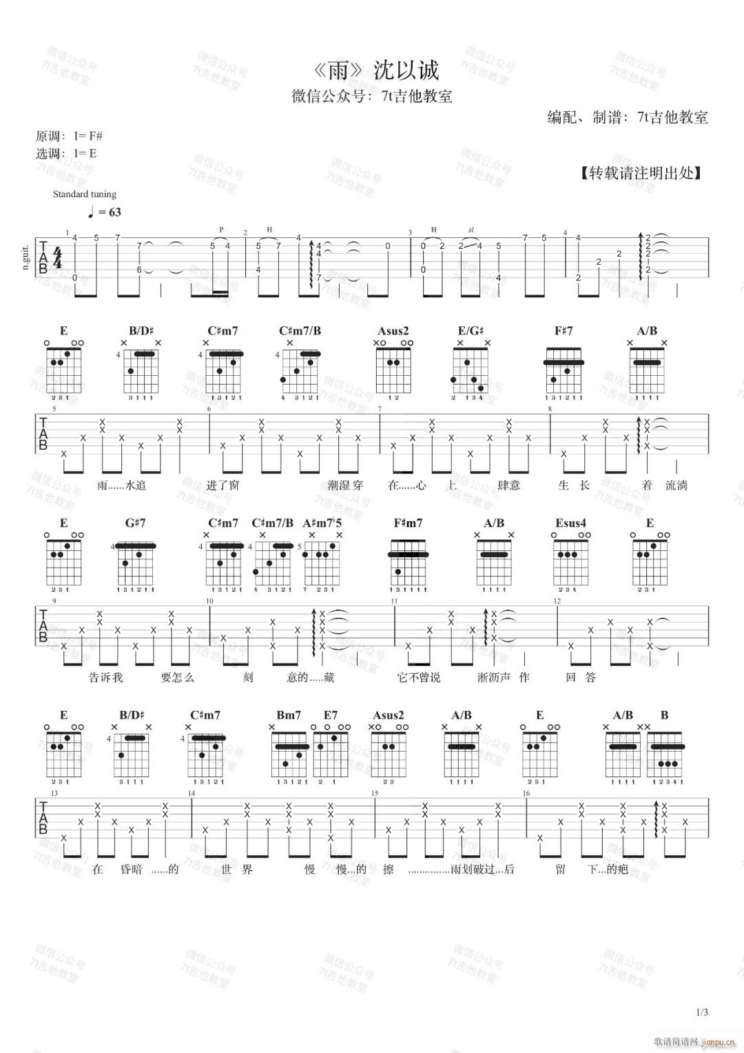 [吉他谱]雨 ( E调指法原版编配) 沈以诚