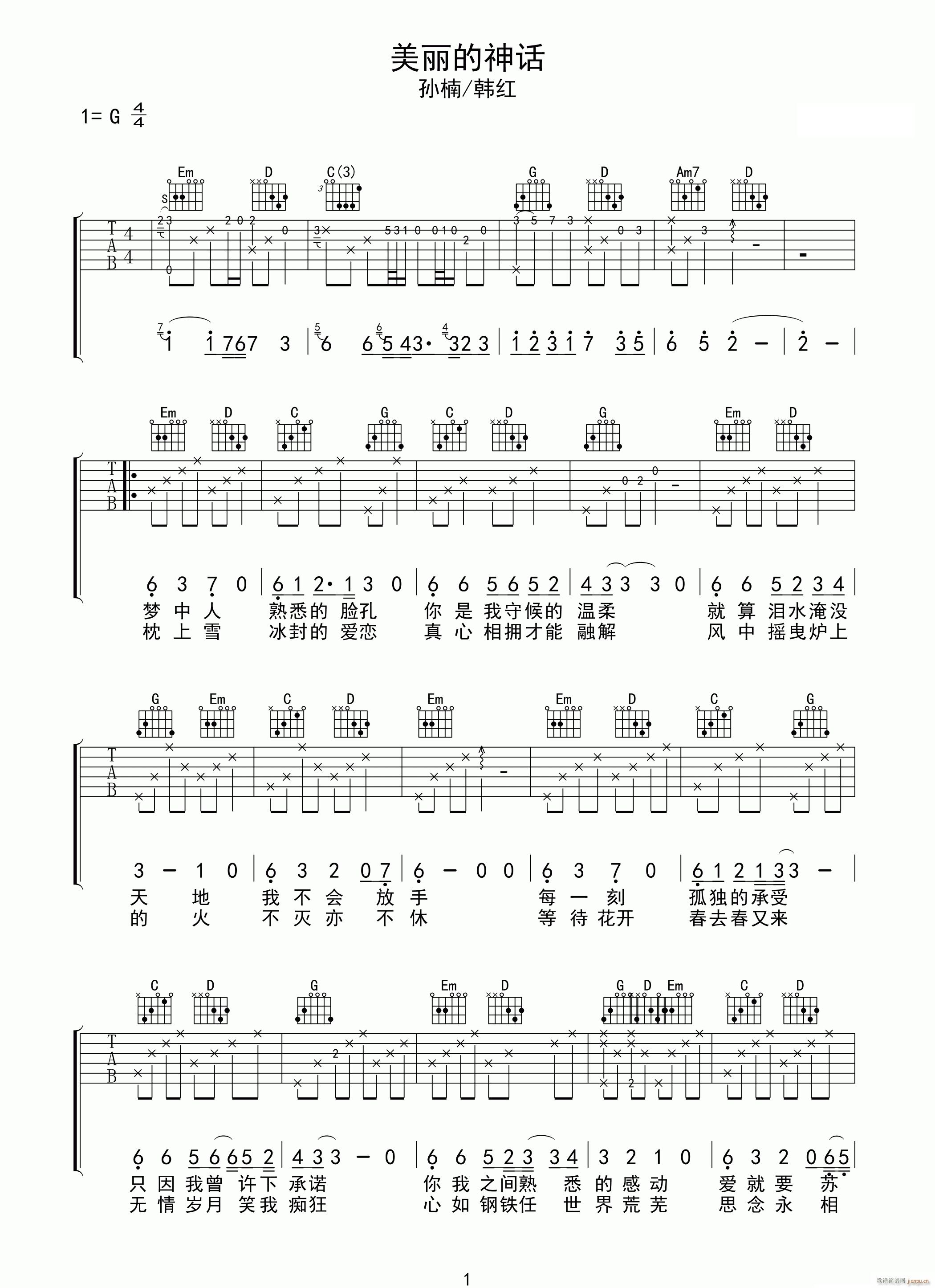 [吉他谱]美丽的神话 ( 韩红 G调原版编配) 孙楠