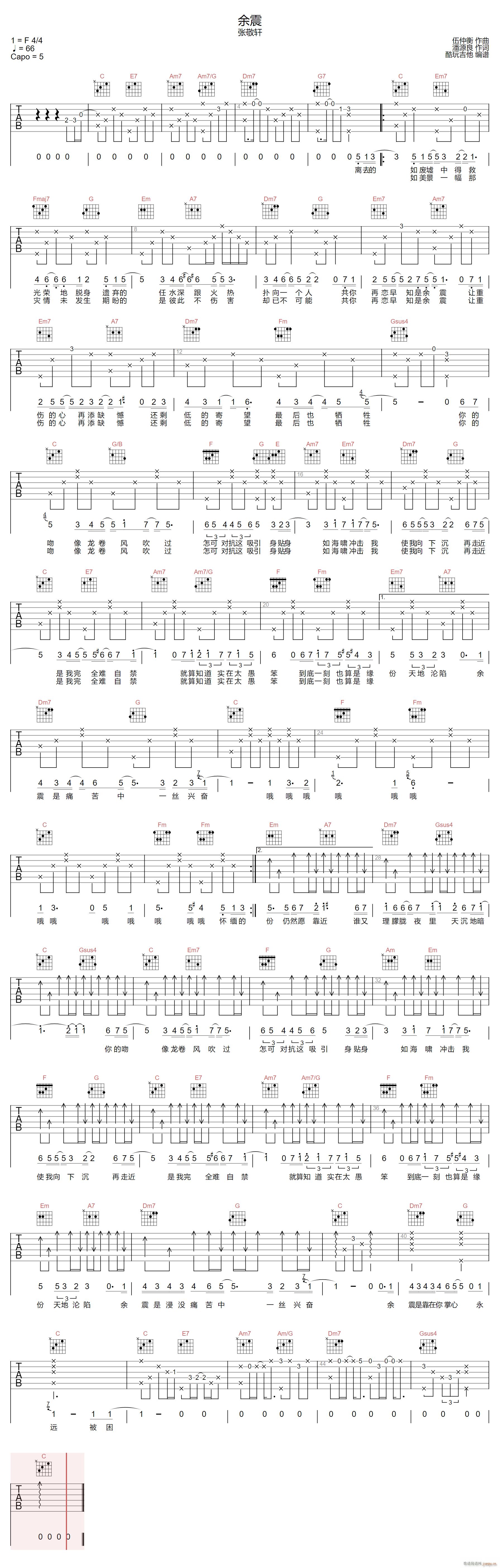 [吉他谱]余震 ( C调指法原版编配) 张敬轩