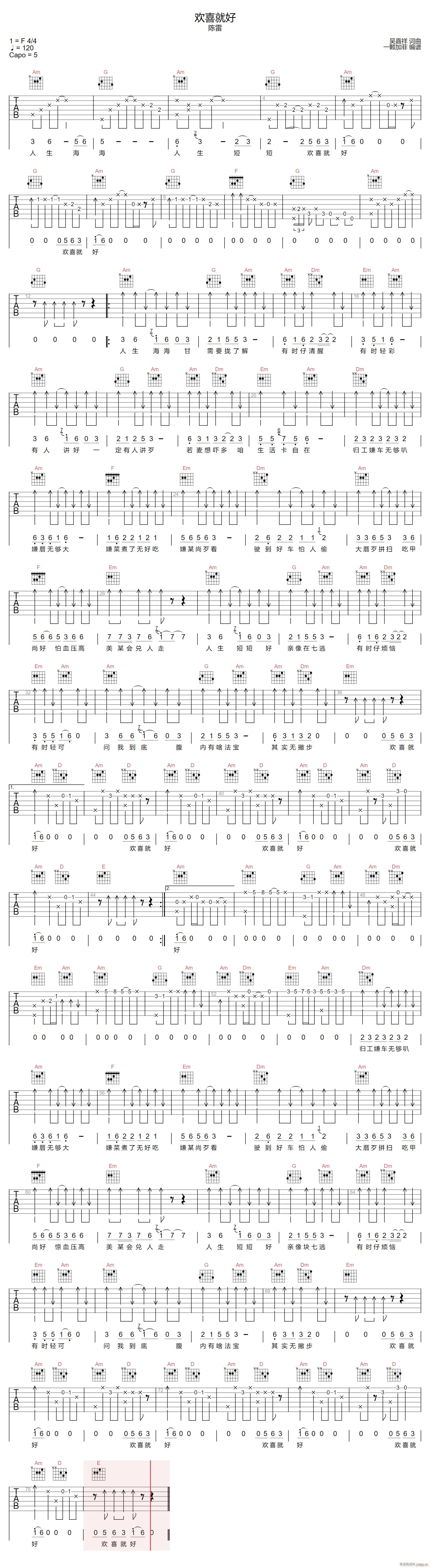 [吉他谱]欢喜就好 ( C调指法原版编配) 陈雷