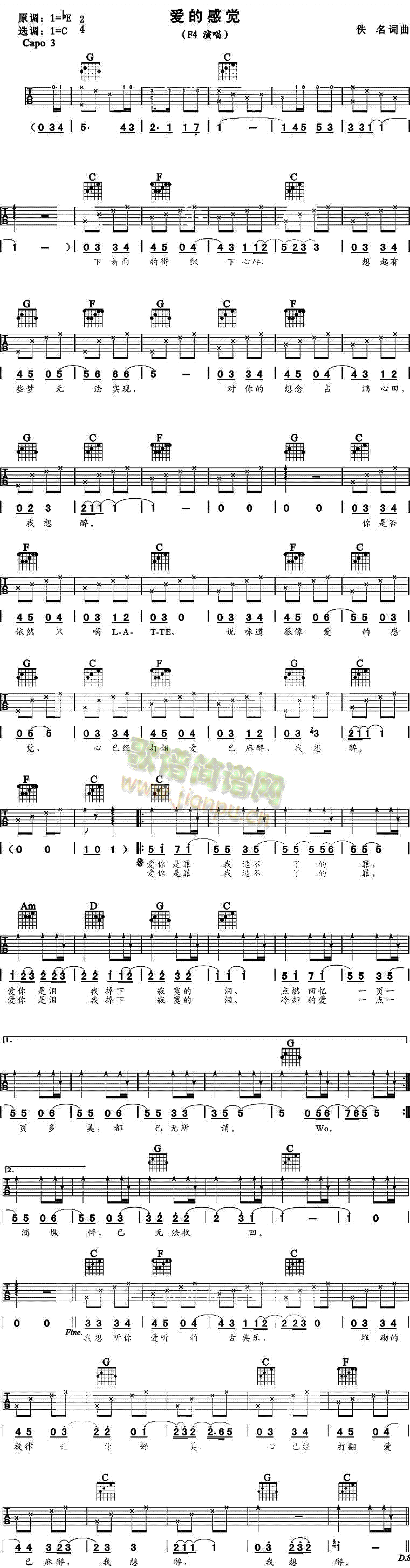 [吉他谱]爱的感觉(f4) 未知