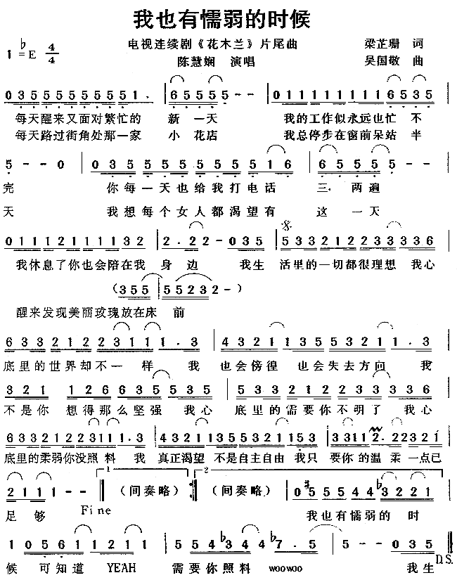 [八字歌谱]我也有懦弱的时候(《花木兰》片尾曲) 陈慧娴