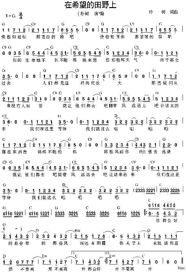[七字歌谱]在希望的田野上[合唱曲谱] 未知