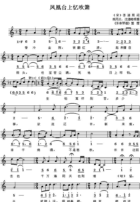 [七字歌谱]凤凰台上忆吹箫 李清照