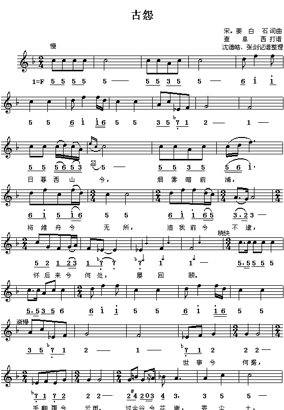 [钢琴谱](宋)姜白石:古怨(查阜西打谱 简线对照) 未知