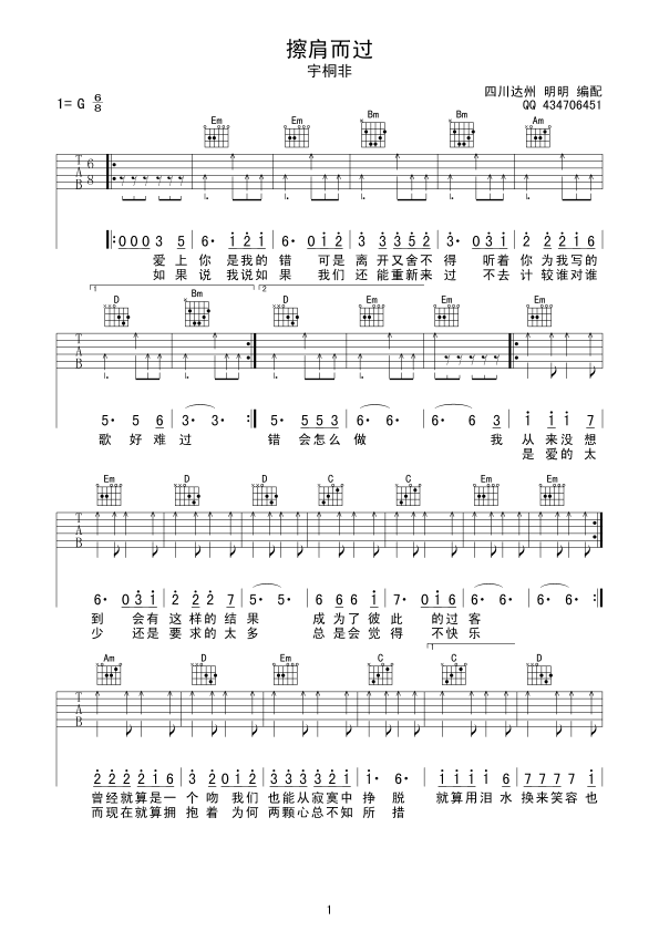[吉他谱]擦肩而过 宇桐非 宇桐非