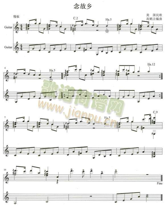 [吉他谱]念故乡吉他二重奏(五线谱) 高鹤立编曲