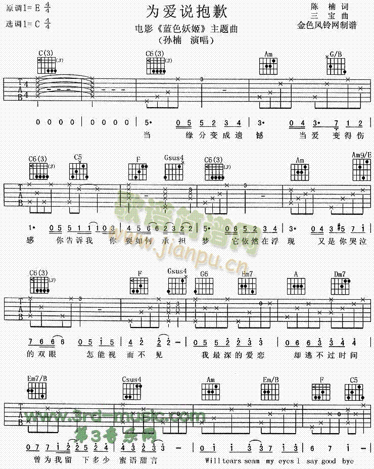 [吉他谱]为爱说抱歉(《蓝色妖姬》主题曲) 孙楠