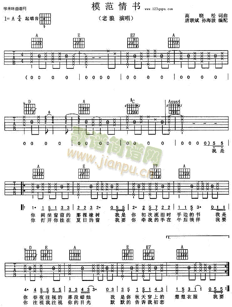 [九字歌谱]模范情书 歌曲类 简谱 老狼