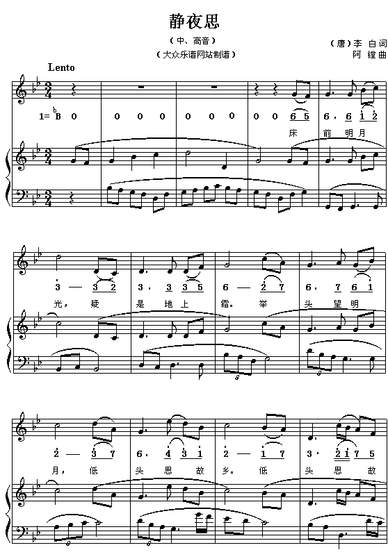 [钢琴谱](唐)李白:静夜思(阿镗曲 简线对照 附钢琴伴奏) 未知